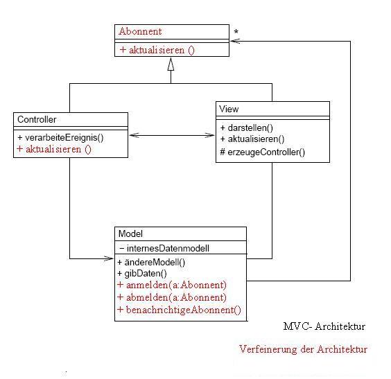 Mit dem Änderungs-Verbreitungs Mechanismus kann die gesamte MVC-Architektur verfeinert werden.Verleger bietet Operationen zur An- und Abmeldung von Abonnente, die an Mitteilunges des Verlegers interessiert ist, sich durch Anmeldung beim Verleger registrieren.Bei neuer Mitteilung des Verlegers werden alle Abonnenten durch Aufruf einer bestimmten Methode benachrichtigt.Methode wird durch Schnittstelle definiert, die jeder Abonnent implementiert.Das nennt man Verleger-Abonnent Architektur.